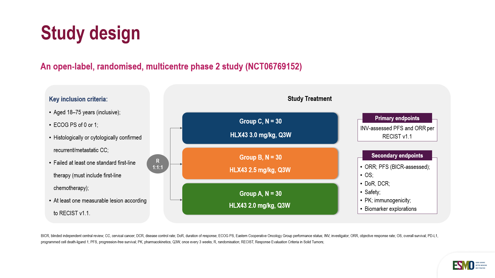 本次发布基于一项开放、随机、多中心的II期临床研究,由山东省肿瘤医院于金明院士牵头召开。经组织学确诊为复发/晚期宫颈癌(CC)且既往接受过标准一线治疗失败、不耐受或禁忌的患者,按1:1:1比例随机分组,每3周接受一次剂量为2 mg/kg、2.5 mg/kg或3 mg/kg的HLX43治疗。主要终点为研究者根据RECIST v1.1评估的客观缓解率(ORR)和无进展生存期(PFS)。次要终点包括其他有效性指标、安全性、药代动力学、免疫原性和生物标志物探索。