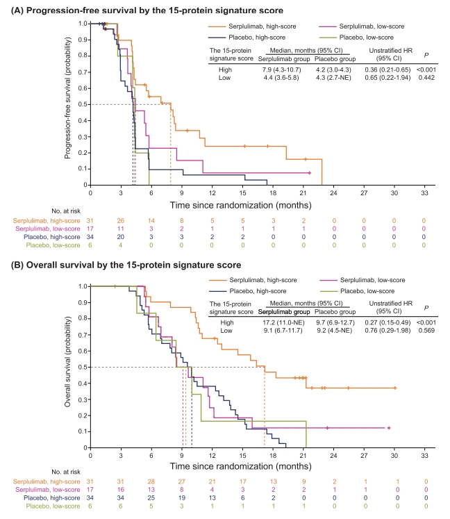 至2022年6月13日數據截止時,在意向治療人群中,斯魯利單抗組和安慰劑組的中位OS分別為15.8個月和11.1個月(HR 0.62;95% CI: 0.50-0.76;描述性P < 0.001)。顺利获得比較斯魯利單抗組中達到客觀緩解和未達客觀緩解的患者的血清蛋白質組,鑑定出181個DEPs,並由此構建了基於15個蛋白表達水平的分子標誌物組合(15-蛋白標誌物組合)。研究結果顯示,在斯魯利單抗組中,較高的15-蛋白標誌物組合評分與更長的OS和PFS顯著相關(見下圖)。此外,攜帶RB1基因突變或Notch通路突變的患者,與攜帶對應的野生型基因的患者相比,取得ORR、OS或PFS改善。基線中性粒細胞與淋巴細胞比值(NLR)和乳酸脫氫酶(LDH)水平則是ES-SCLC患者的獨立預後因素。