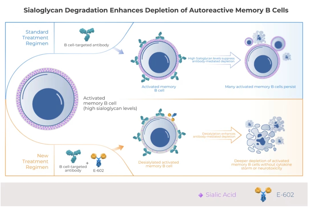 近年來,以利妥昔單抗(抗CD20單抗)等靶向抗體為代表的B細胞清除療法,已在全球多個市場獲批並被中華醫學會腎臟病學專家共識推薦用於治療腎小球腎炎[1]。然而,許多患者對這類藥物的治療反應並不理想。糖免疫给予了一種治療自身免疫疾病的新方法。該策略顺利获得酶解唾液酸糖苷,打破致病性免疫細胞的「保護屏障」, 從而增強其清除效果,幫助恢復機體免疫平衡。