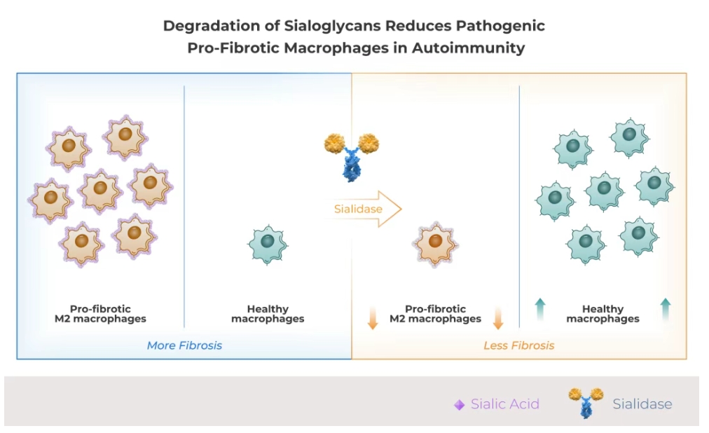 HLX79是基於Palleon的EAGLE糖編輯平台開發的潛在「同類首創」的人唾液酸酶融合蛋白。HLX79 顺利获得酶解唾液酸糖苷,從而增強對兩類在自身免疫疾病中高度致病的免疫細胞的清除:一是驅動炎症的自身反應性記憶B細胞,二是促進纖維化和器官損傷的M2型巨噬細胞。